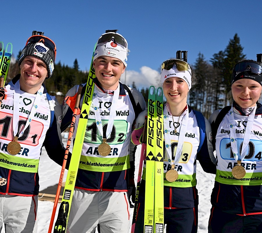 Bei den Nachwuchs-Weltmeisterschaften im Biathlon in Arber im Bayerischen Wald erobert Österreichs Staffel die Goldmedaille in der Jugendklasse. Das Quartett lag im Ziel fast eineinhalb Minuten vor Norwegen.